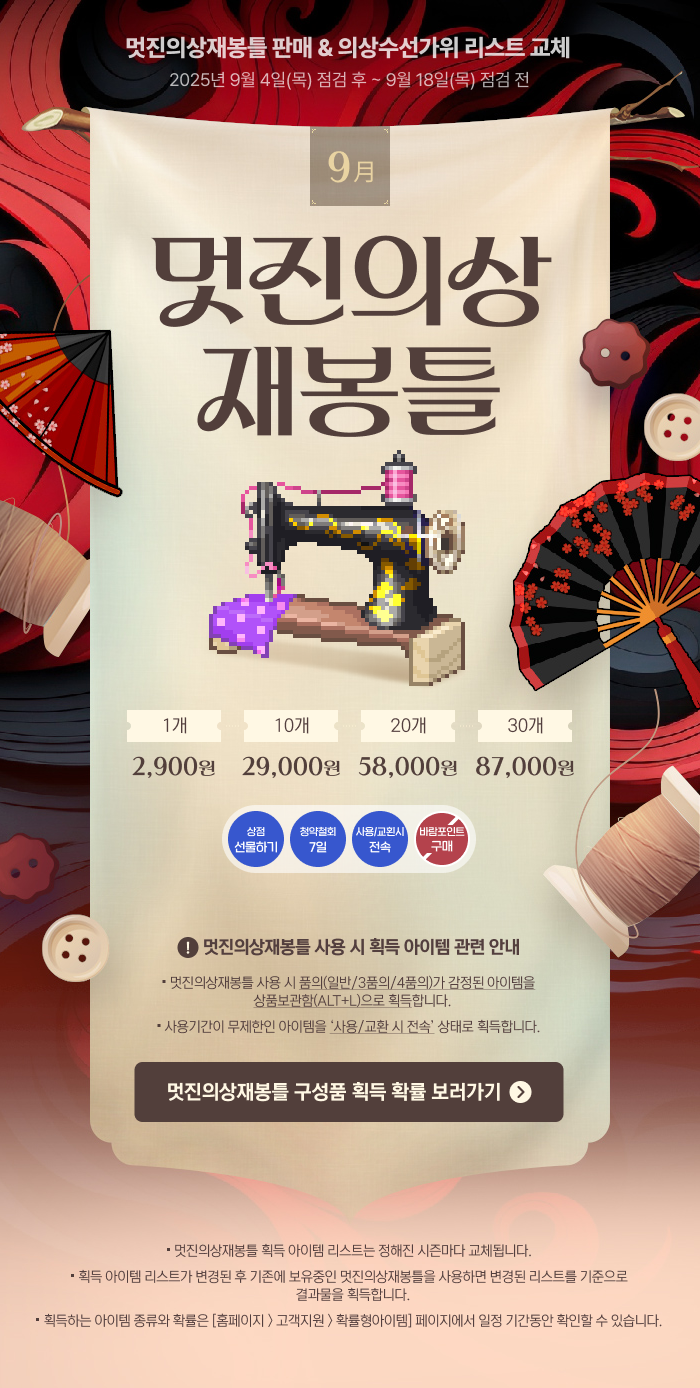 2025년 9월 4일(목) 점검 후부터 빛나는멋진실타래를 정해진 수량만큼 모아서 사용 시 명품의로 교환할 수 있습니다.